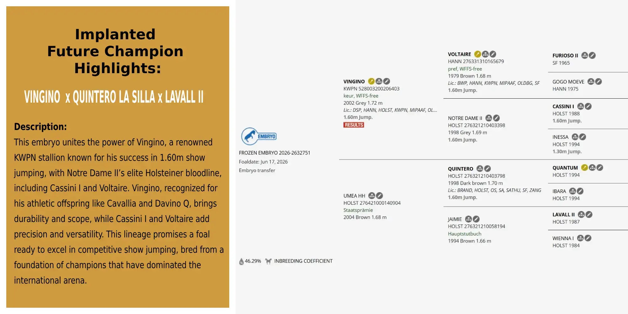 Investing in this embryo secures access to an exceptional genetic combination with endless possibilities for sport and breeding. Key highlights include: