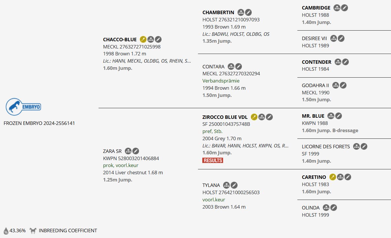 The combination of Zara SR and Chacco-Blue represents a pinnacle of modern sport horse breeding. This carefully selected frozen embryo blends two of the most prestigious bloodlines in showjumping, ensuring exceptional athleticism, intelligence, and rideability. With a calculated inbreeding coefficient of 43.36%, this match has been meticulously designed to produce a future champion for the highest levels of competition.