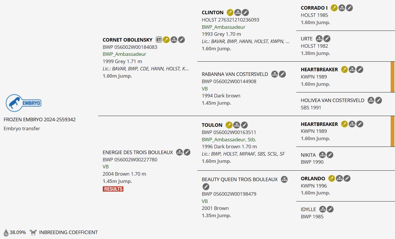 The pairing of Evita Van Het Overes and Heartbreaker combines the power and brilliance of two legendary bloodlines. This frozen embryo, with a strategic inbreeding coefficient of 40.43%, consolidates decades of proven performance to create a future star for showjumping or breeding.