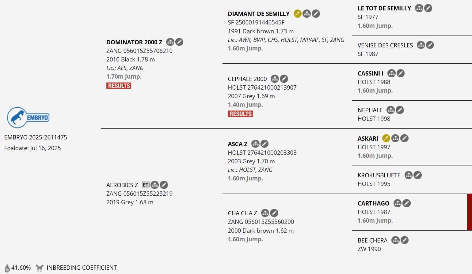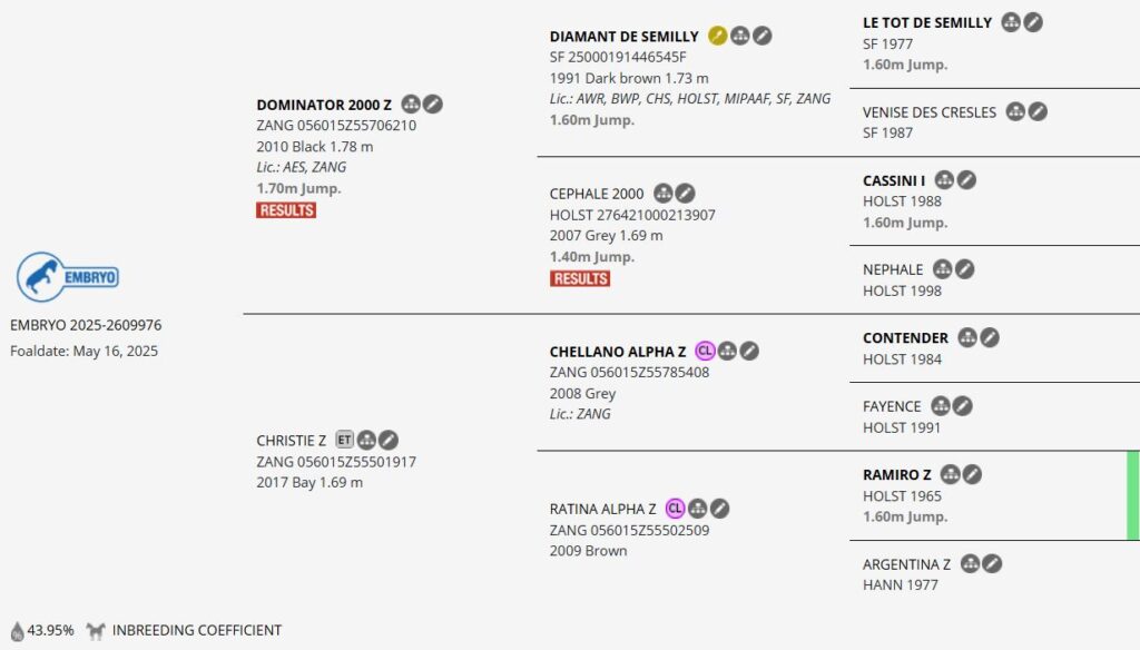 The pairing of Aerobics Z SCI and Dominator 2000 Z represents the culmination of elite sport horse breeding, designed to produce a foal with unmatched power, rideability, and scope. Scheduled to be born on July 16, 2025, this embryo carries an impressive inbreeding coefficient of 41.60%, emphasizing a carefully calculated blend of performance and genetics that defines the future of showjumping champions.