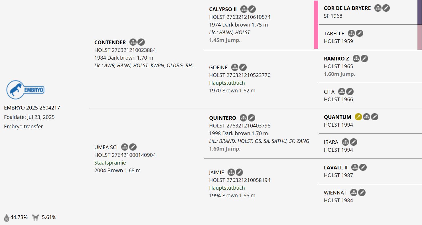 The pairing of UMEA SCI and CONTENDER brings together the best of Holsteiner breeding, ensuring a foal with exceptional scope, power, and rideability. With an impressive 44.73% inbreeding coefficient, this embryo is strategically designed to consolidate the proven genetics of elite showjumpers, making it an invaluable addition to any breeding or sport program.