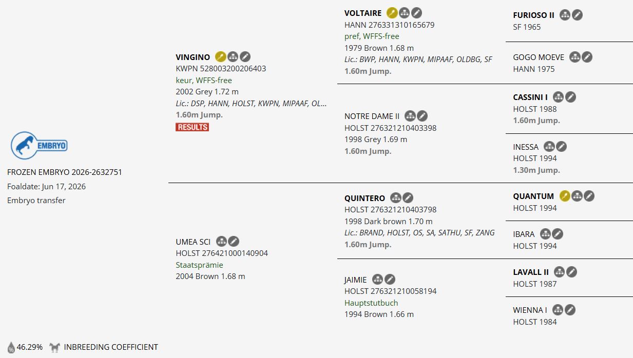 This vitrified embryo combines the prestigious bloodlines of Vingino, a proven international competitor, with Umea SCI, a mare of exceptional Holsteiner lineage. The pairing is designed to produce a foal with unparalleled athleticism, scope, and versatility, making it a perfect candidate for high-level showjumping and elite breeding programs.