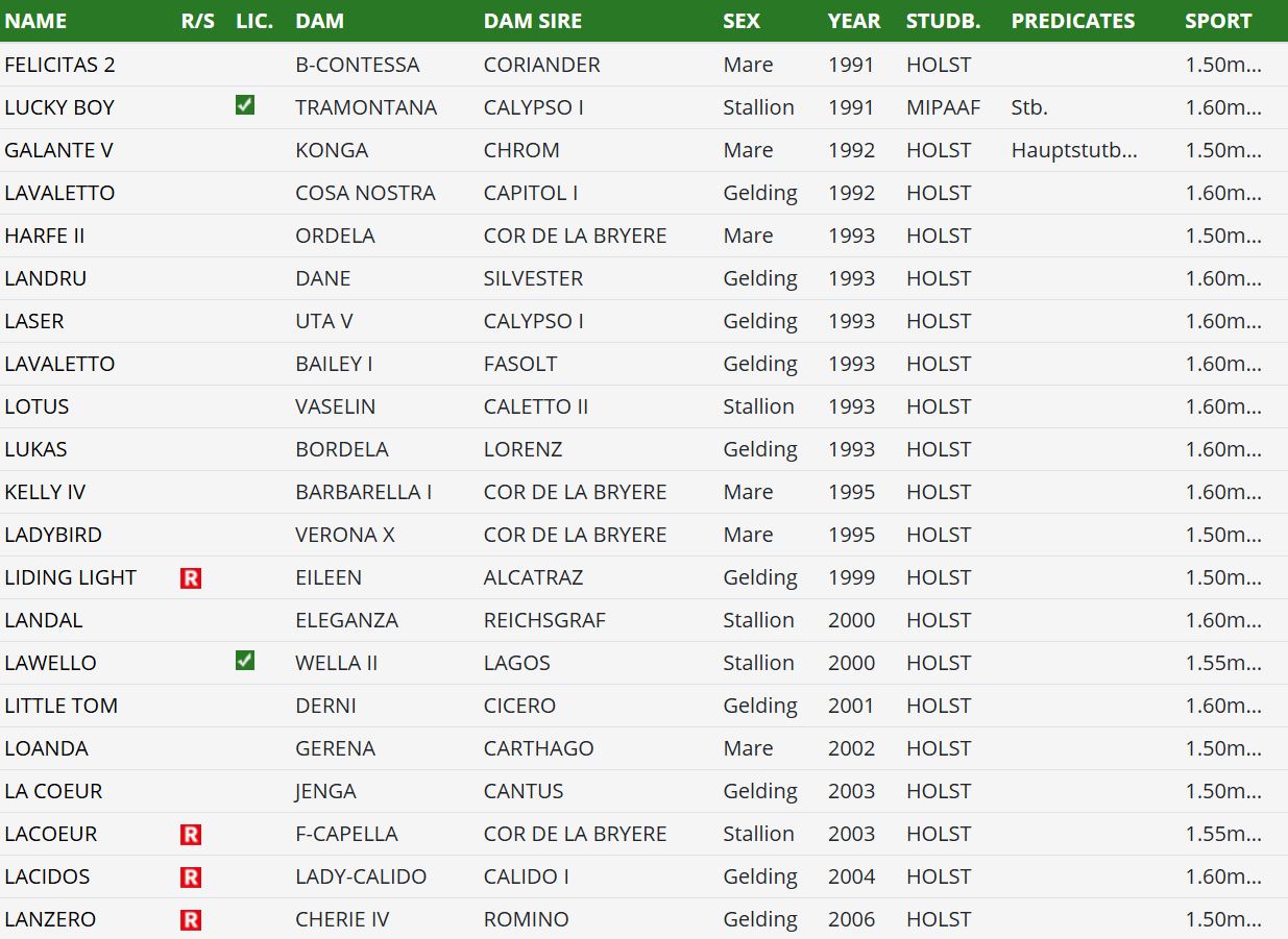 Carthago is one of the most celebrated sires in showjumping history, renowned for his exceptional technique, scope, and rideability. His influence is evident through countless successful progeny at the highest levels of the sport: