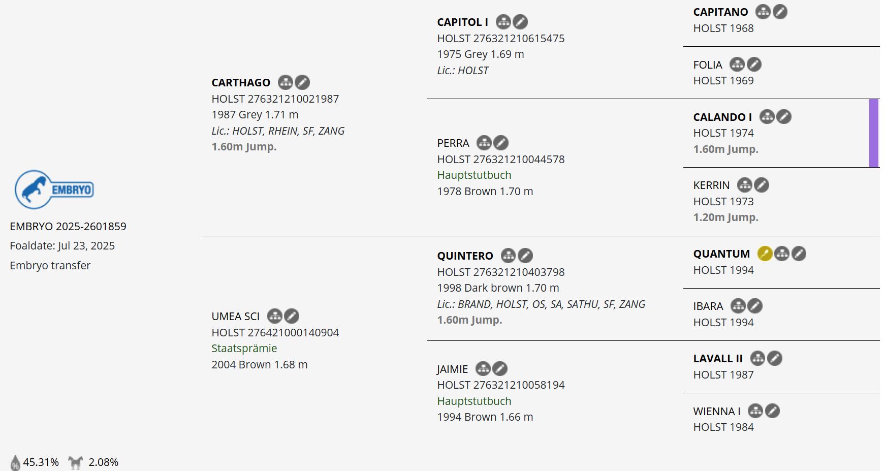 The Carthago x Umea SCI embryo combines two of the most influential bloodlines in showjumping, delivering: